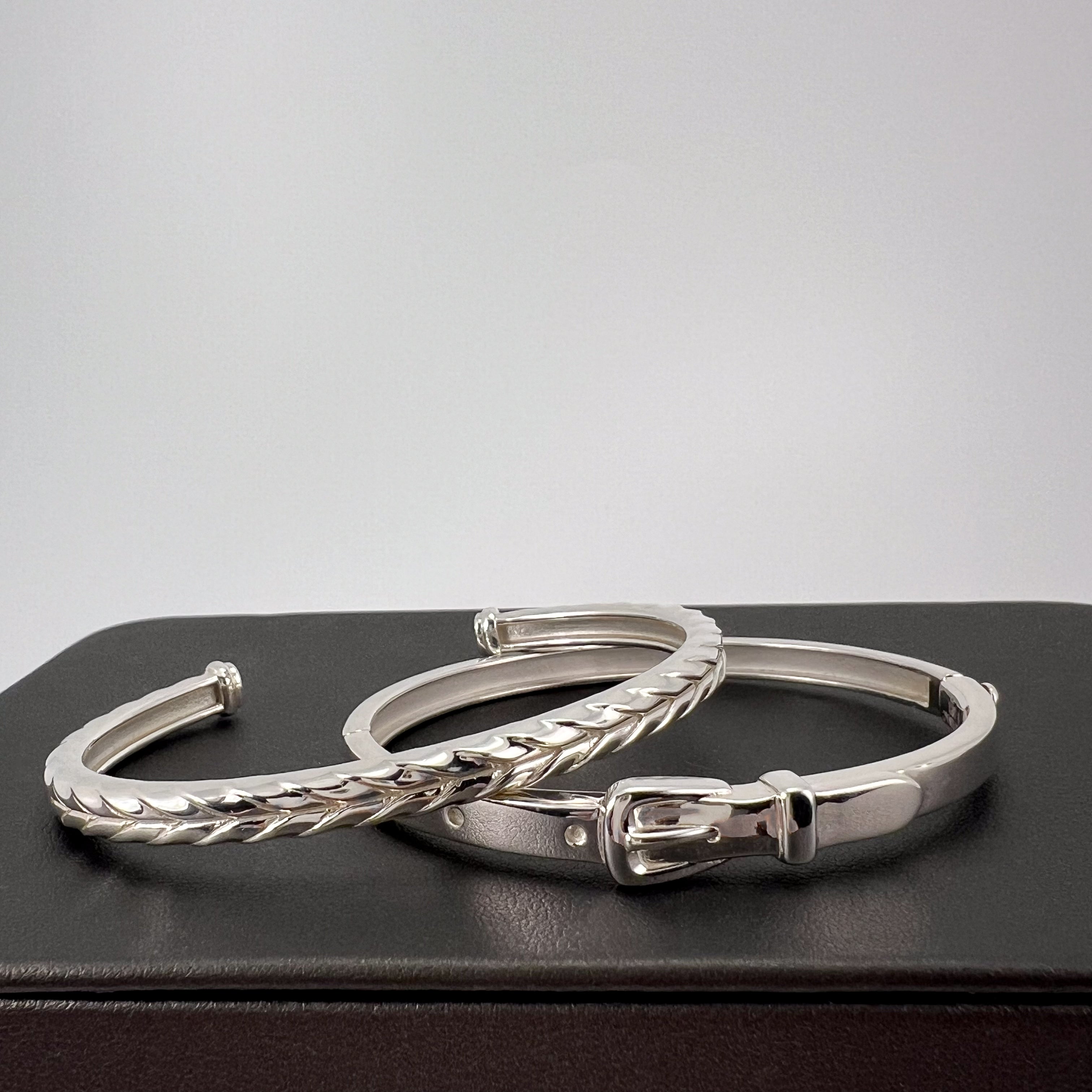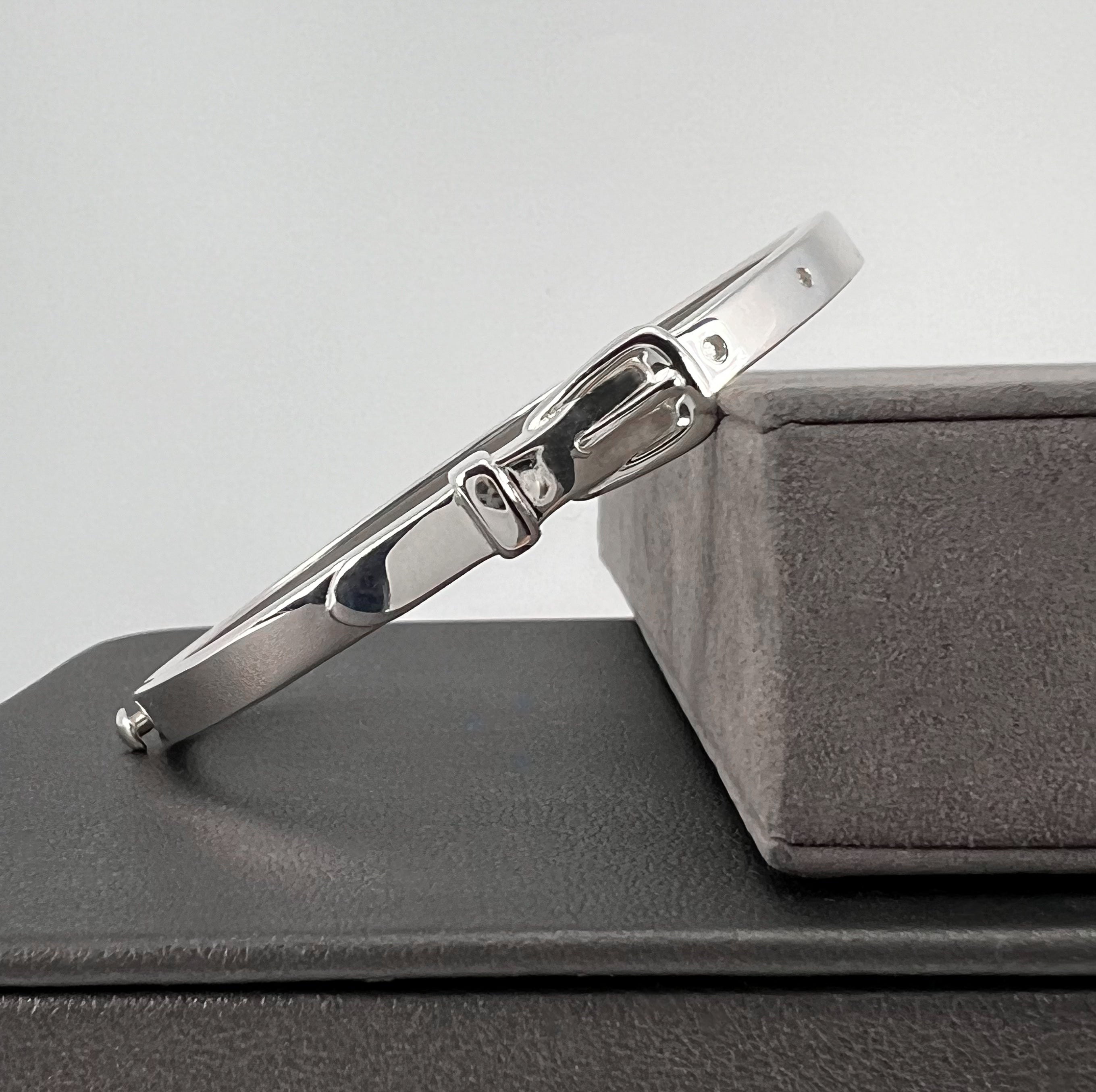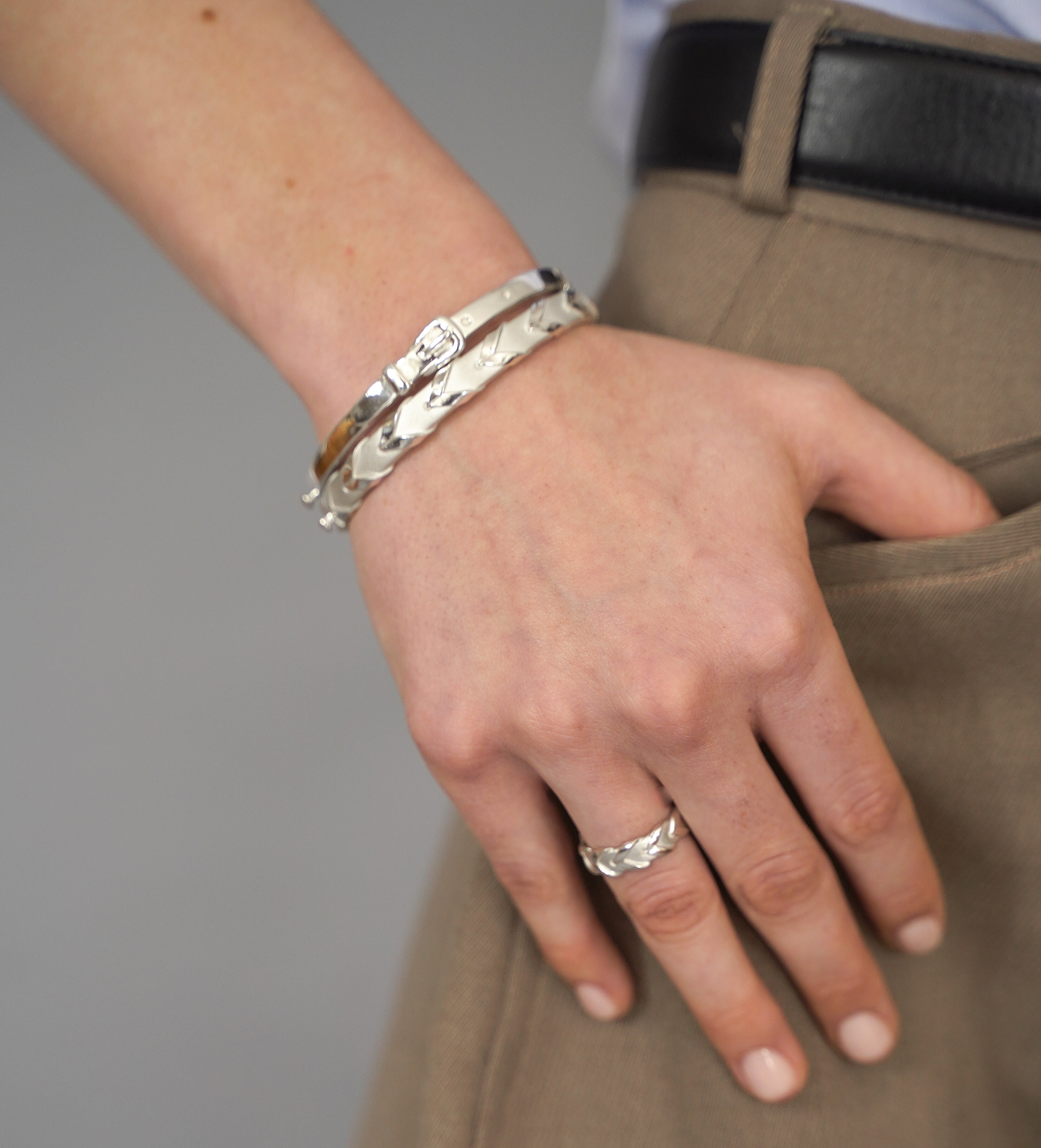 Designed with an elegant elliptical shape to fit close to your wrist, it's perfect for comfortable everyday wear and stacks beautifully with our other bracelets. Featuring an authentic English rein buckle and strap detail, hidden hinge, and a secure push-button clasp. It makes a perfect balance of elegant everyday equestrian luxury.