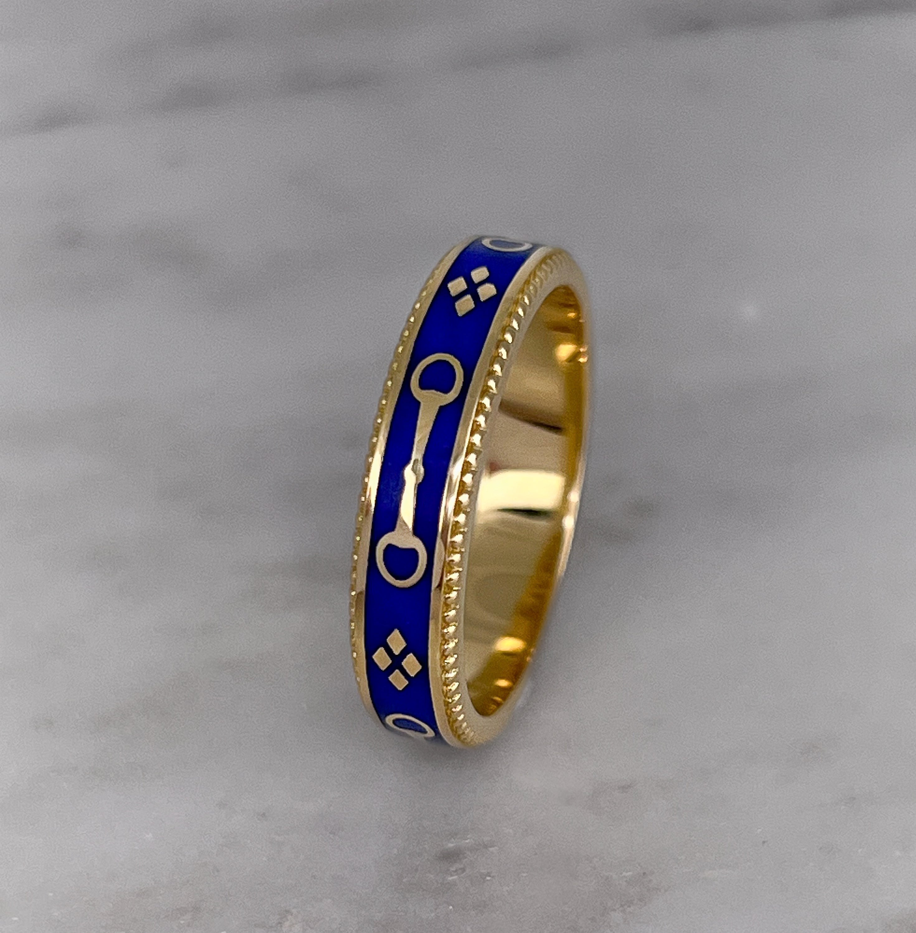 This exquisite gold and enamel ring captures timeless equestrian style with its unique design of classic English snaffle bits and diamond motifs, framed by delicate beaded edges. It's meticulously crafted in solid 18k yellow gold and lustrous hard fired enamel.