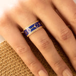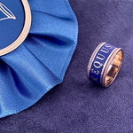 A Truly Unique Statement Ring. Beautifully crafted in solid 18k yellow gold and deep lapis blue enamel with hand cut coin edges. An eternity design featuring EQUUS (Latin for horse), Snaffle Bits and Star Motifs. Wear either side facing up! Bold on its on, or pair with our gold stack ring. A Stunning combination.